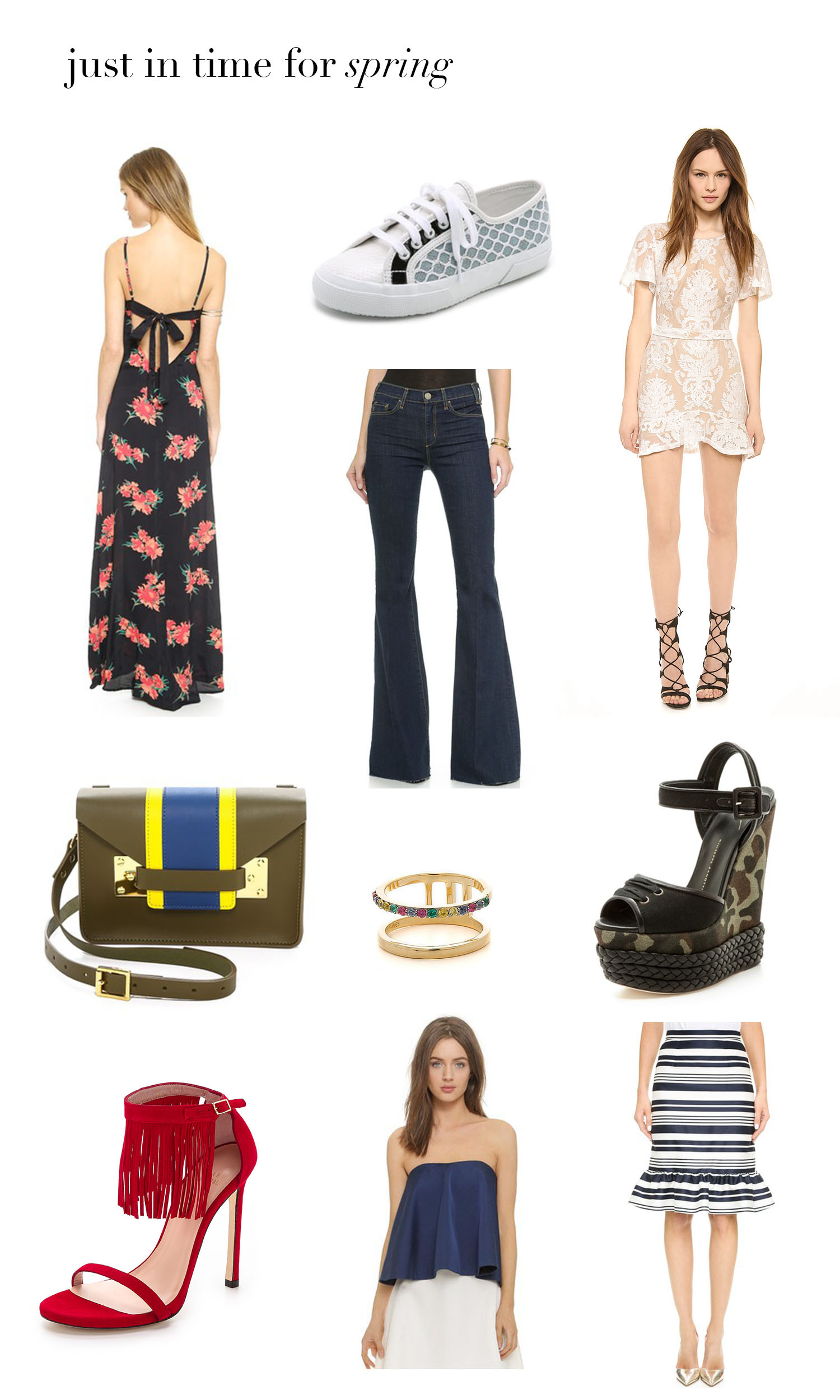 If you’re anything like me, your heart leaps for joy when Shopbop’s tiered sale comes around oh-so infrequently. May the purchase justifications begin, ladies. To start, join the 70s revolution this summer with a flared jean or a floral maxi. If hippies aren’t your thing, try a white hot lace number with a delightfully low back or some sick sneakers from the Rodarte x Superga collection (mesh + patent leather + snakeskin = must-have). This is also the perfect excuse to snag some stand out footwear – like these heavenly camo wedges or a red fringe sandal. We can’t be practical all the time right? Treat yourself before the sale ends tomorrow night. Happy Friday ya’ll!